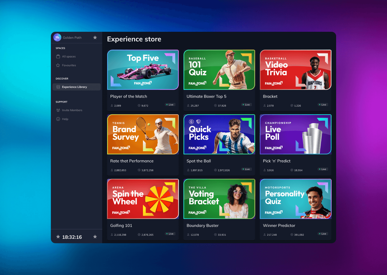 The Interaction Cloud supports fantasy games, bracket predictors, voting, predictions, trivia, sweepstakes, instant win, live data visualisations, play-along games, event centres, personality quizzes, and more. The experience marketplace also includes third-party products from partners like Wave and Ping, all deployable with zero additional integration.